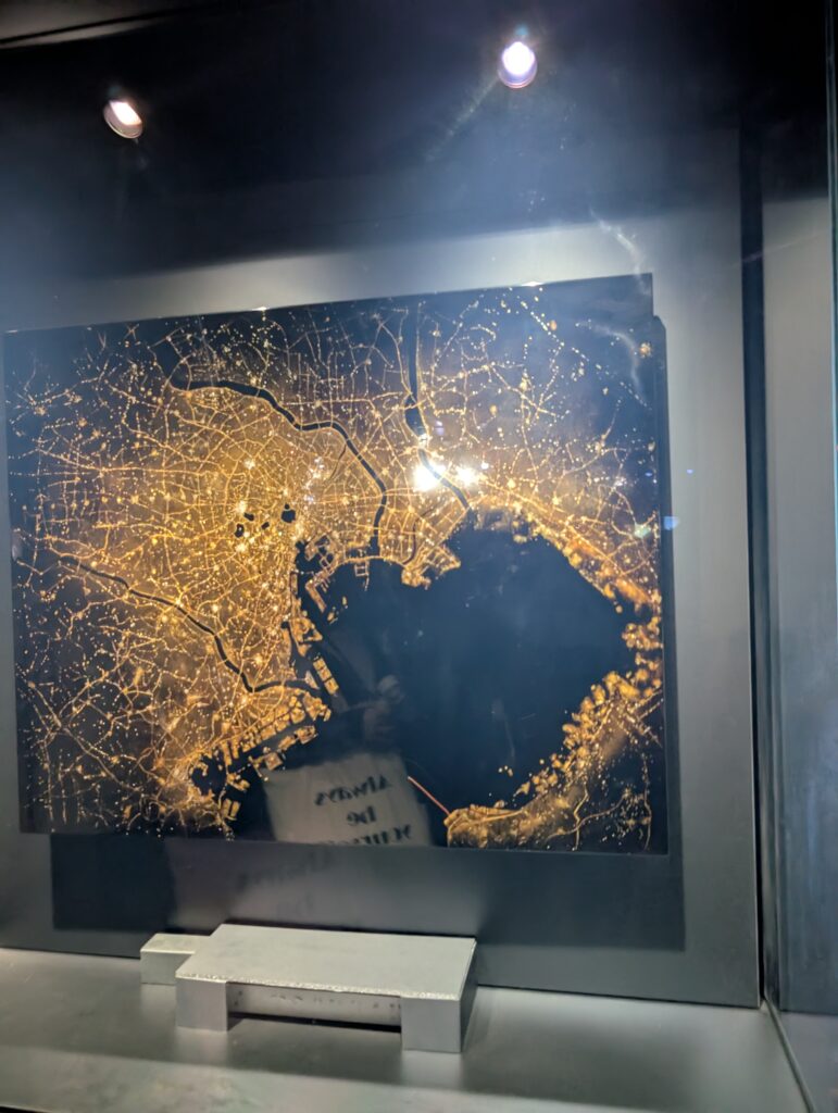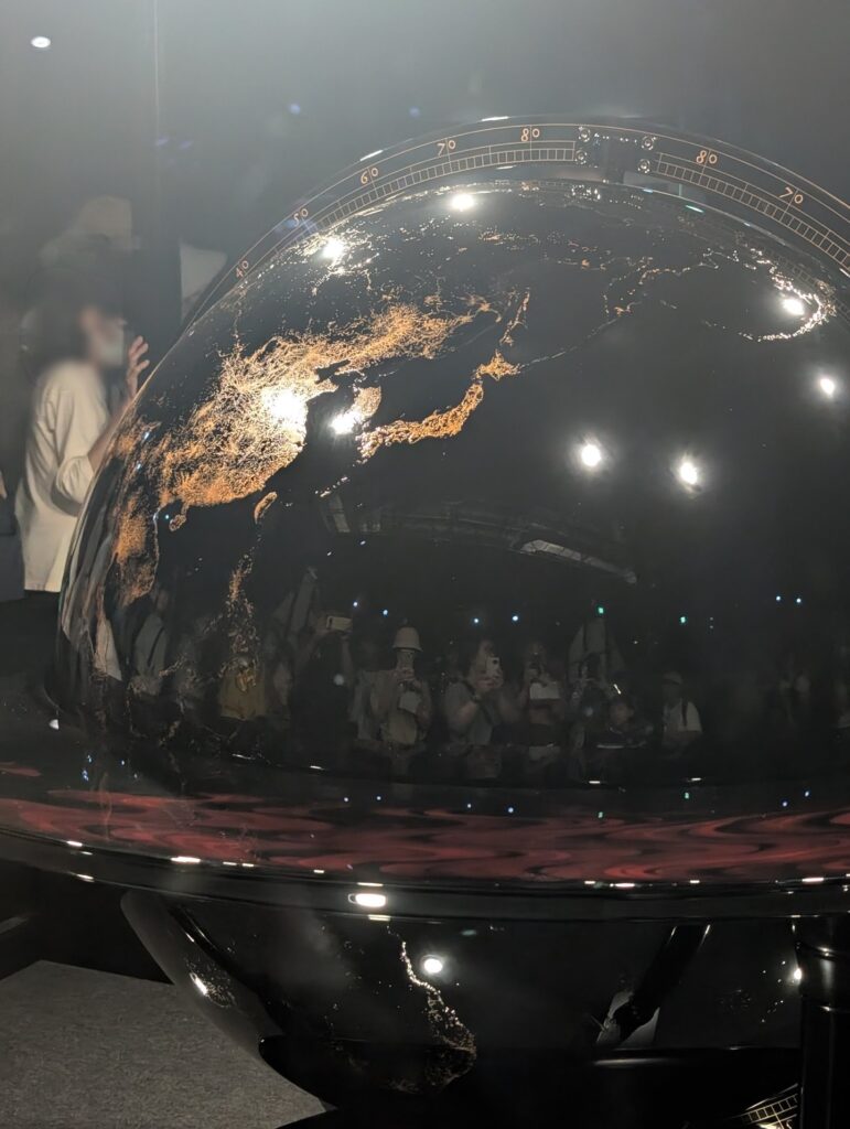 「夜の地球」は輪島塗の地球儀。石川県輪島塗漆芸美術館に展示され、能登半島地震でも奇跡的に無傷だったもの。地球儀とともに展示されていた、世界4都市の夜景をパネルにしたものは、本当に宇宙から見た夜景そのもの。