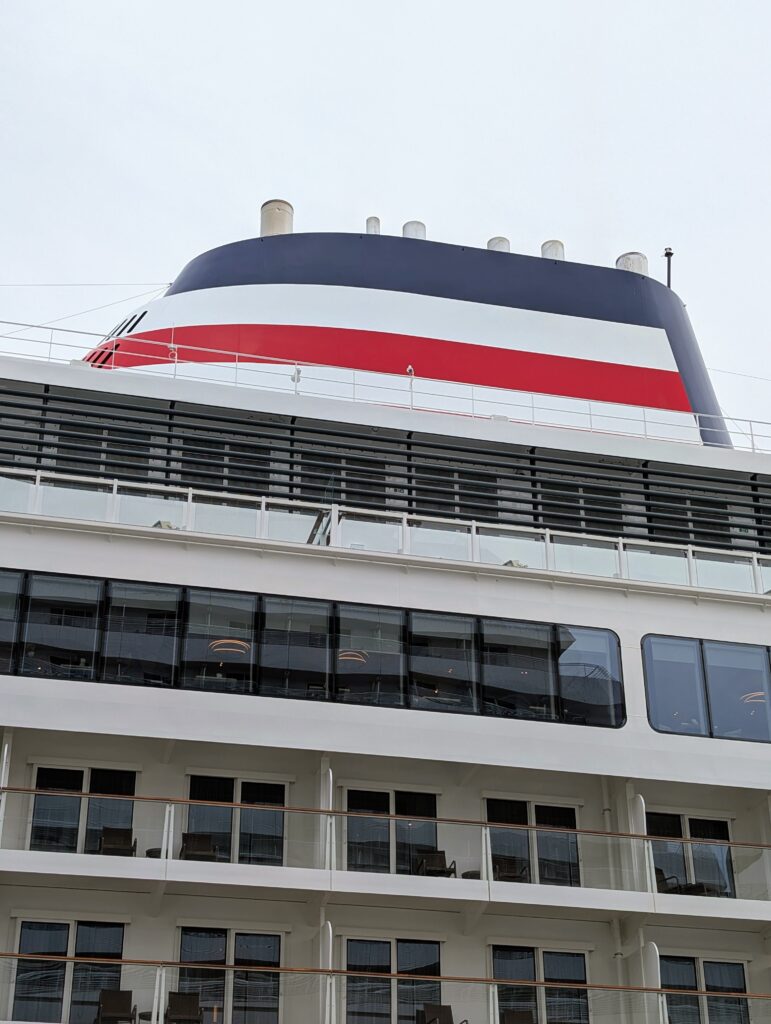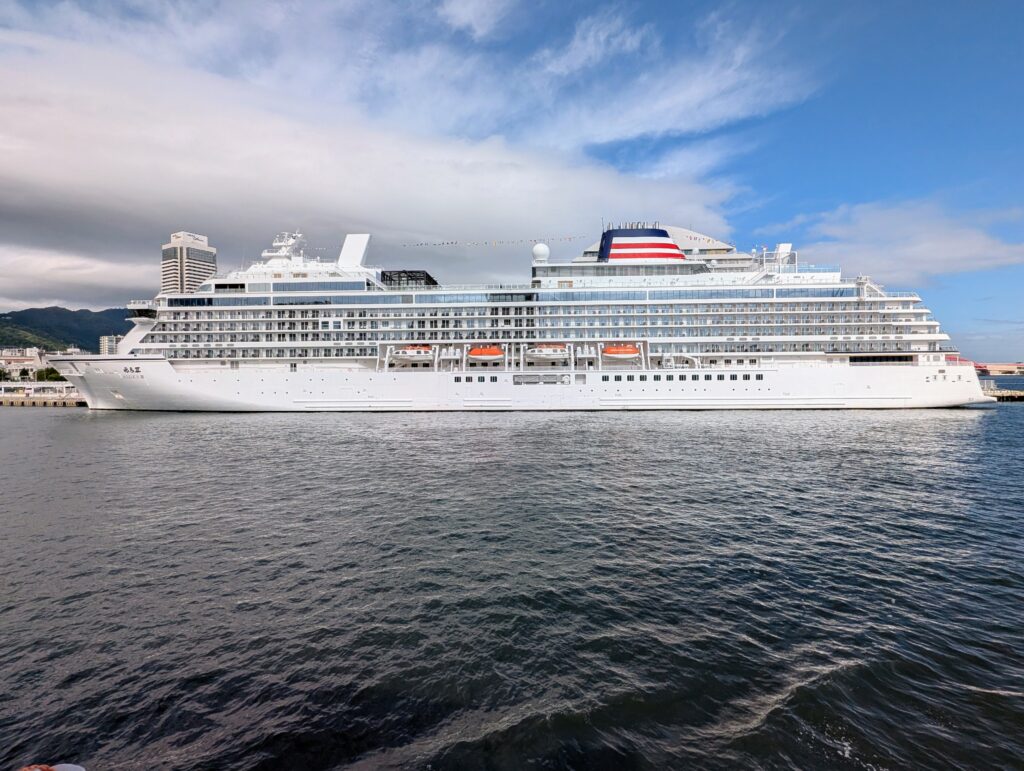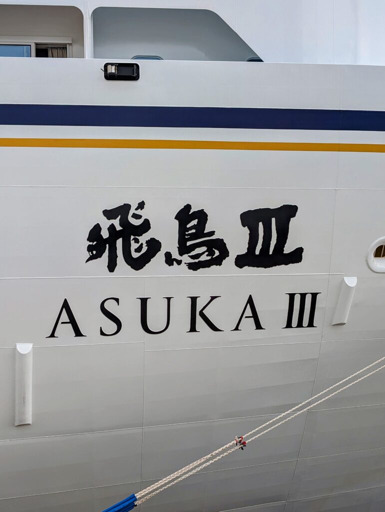 書家・矢萩春恵氏揮毫が揮毫した船名、白地に赤の横線二本、二引のファンネルは「飛鳥Ⅱ」よりやや大きめ。