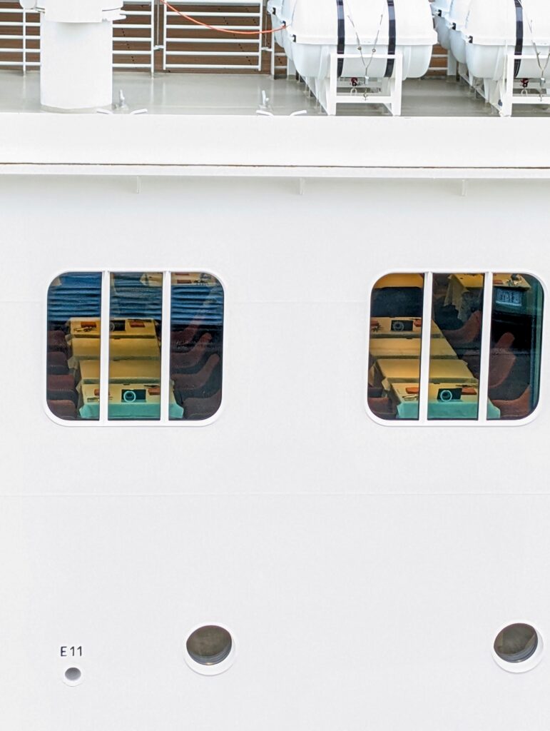 レストラン「フォーシーズンダイニング」と思われる部屋も外から見えました。飛鳥Ⅱのレストランと同じ名前。無料(乗船料に含む)かつ予約不要の最も大きなレストラン。ほとんどの乗客が普段使いするつまりメインダイニングです。