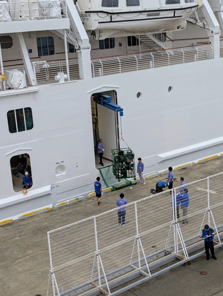 係留作業や荷物の搬出をしばらく眺めていました。ヤマト運輸のトラックが2台、他業者が1台。この日夕方には次のクルーズに向かいます。食材などを積み込むトラックもこれから続々と来るのでしょう。