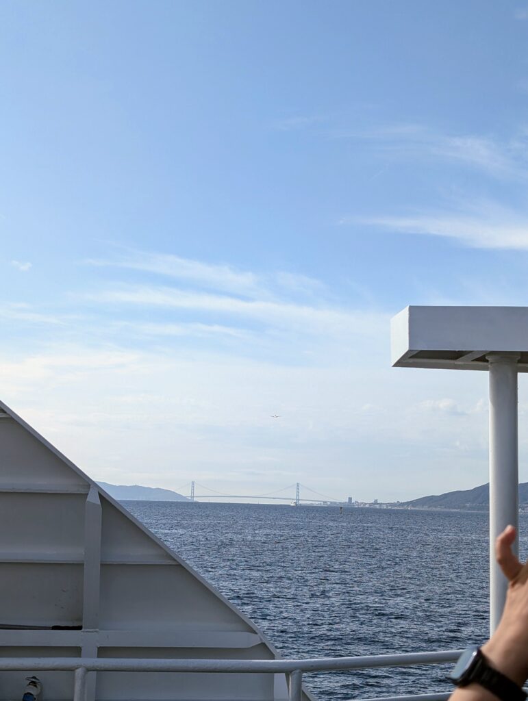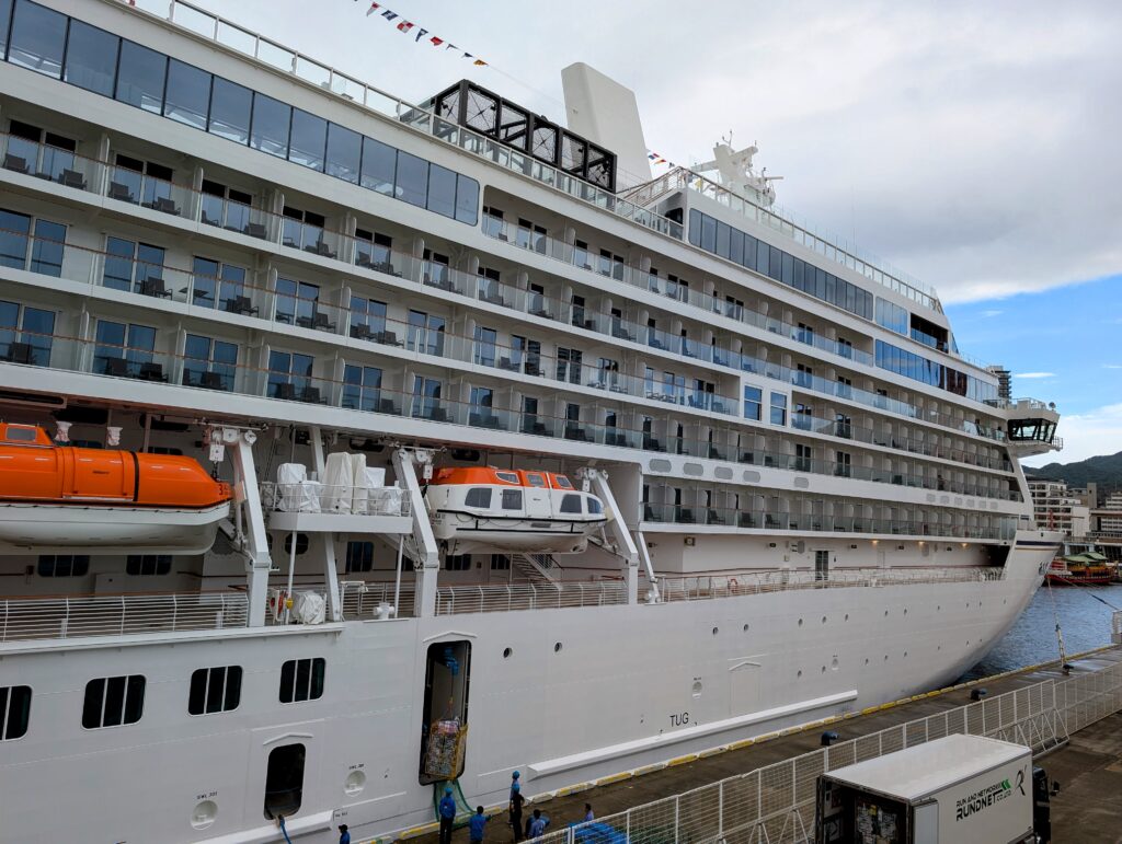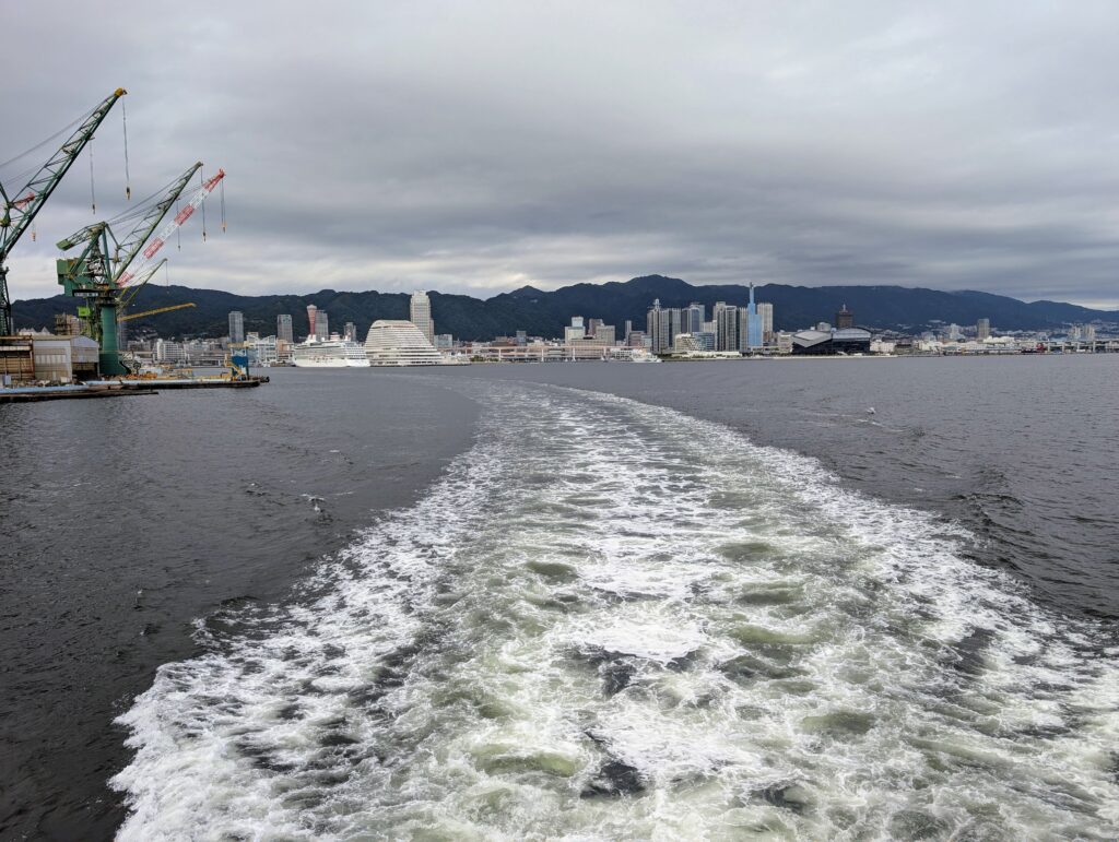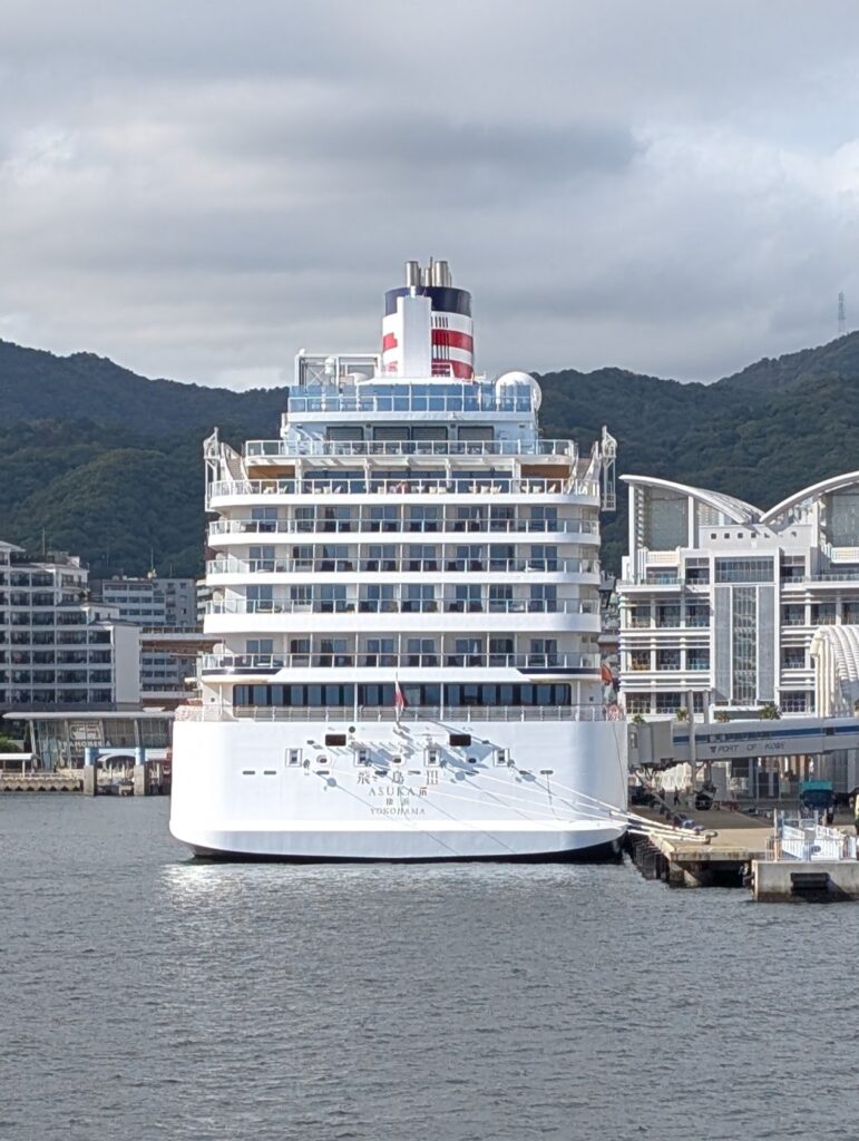 10月13日に神戸を出港した「飛鳥Ⅲ」は、高知沖を西進し、細島(宮崎)、広島を経て瀬戸内海を東進し、神戸に帰港。入港予定は9時でしたが、8時15分にはすでに接岸作業中。9時は乗客の下船が始まる時間ですので、実際はそれより早く接岸します。