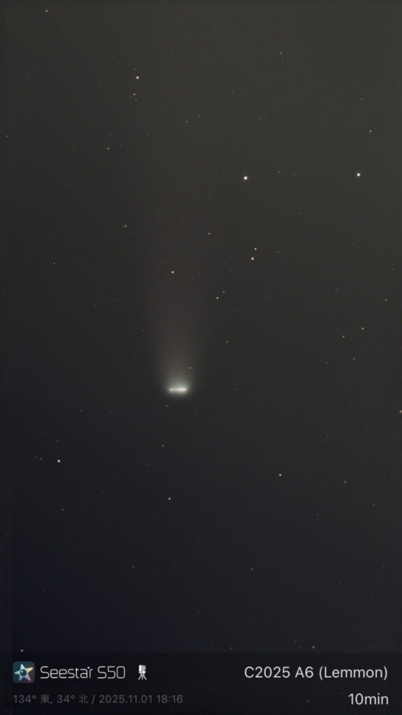 なんだかお天気が良くありません。昼間は快晴でも夕方になると雲が沸きます。特に涼しくなってきてから晴れ間も少なく。 やっと見えました。正確にはSeestar で捉えることができました。双眼鏡で探しましたが見つからず。 10分も露出したらコマが伸びてしまいました。 C2025 A6 (Lemmon)