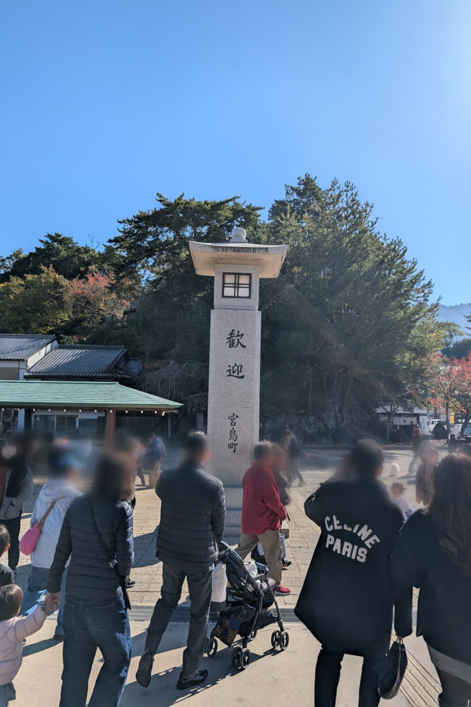 厳島に上陸してすぐ、参拝の行列の最後尾の看板が。しかしその先、特に列がわけられているでもなく。列に並ばずどんどん追い越していく人たち。