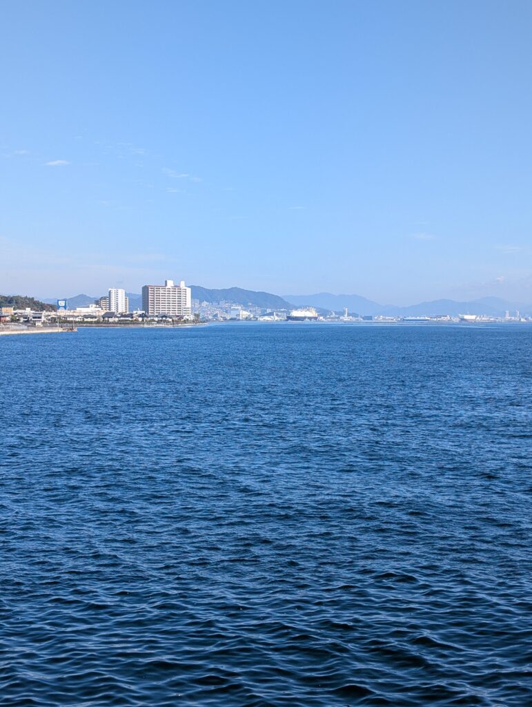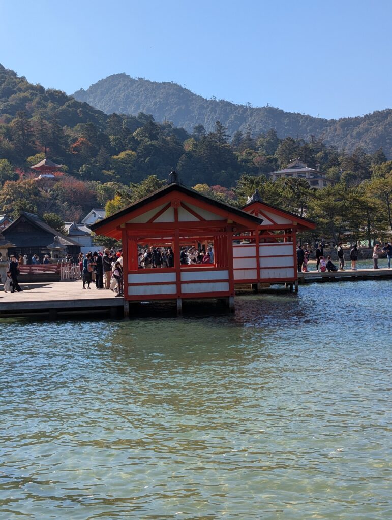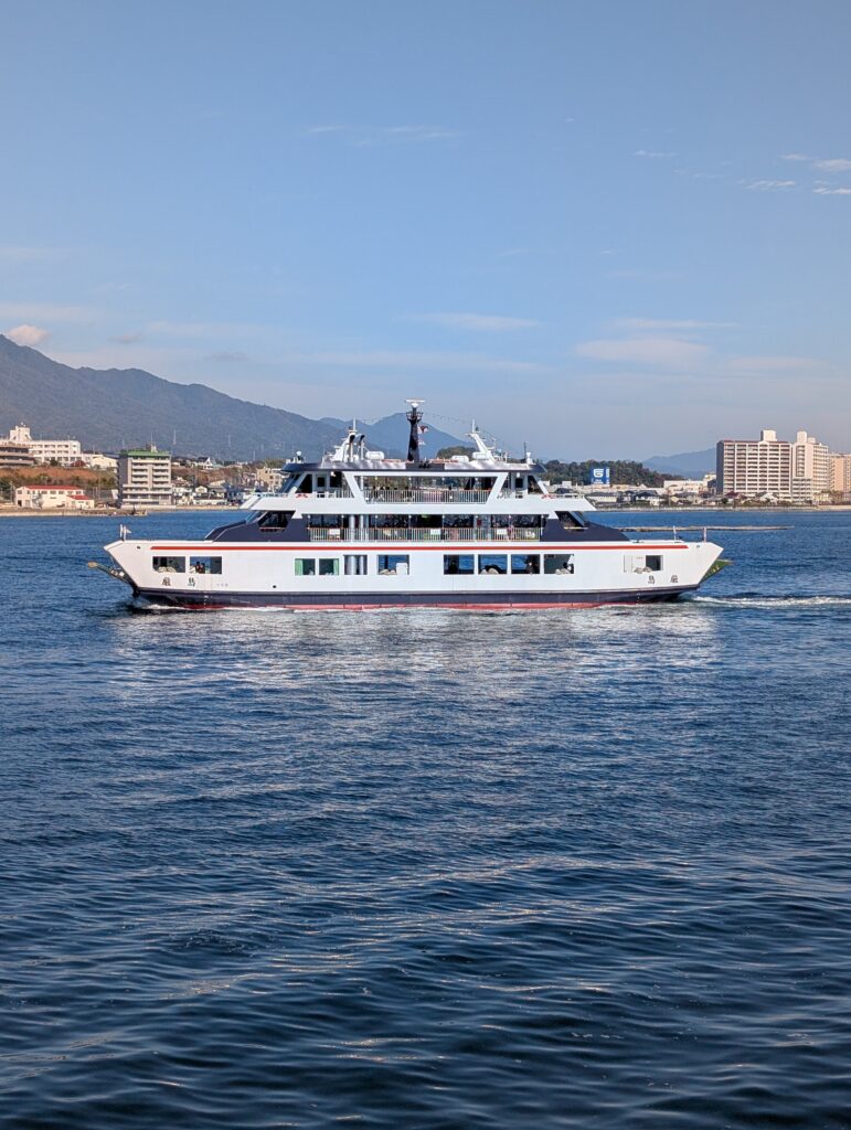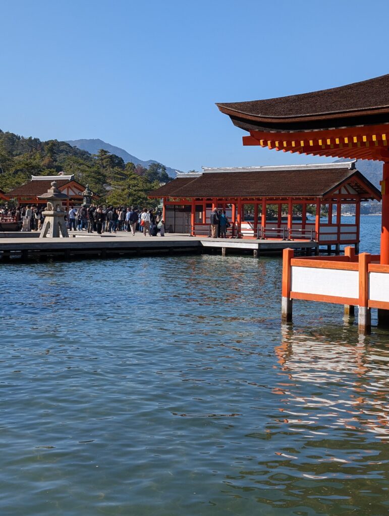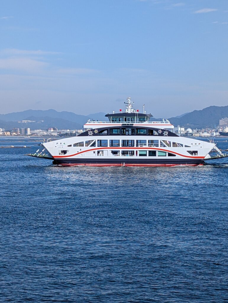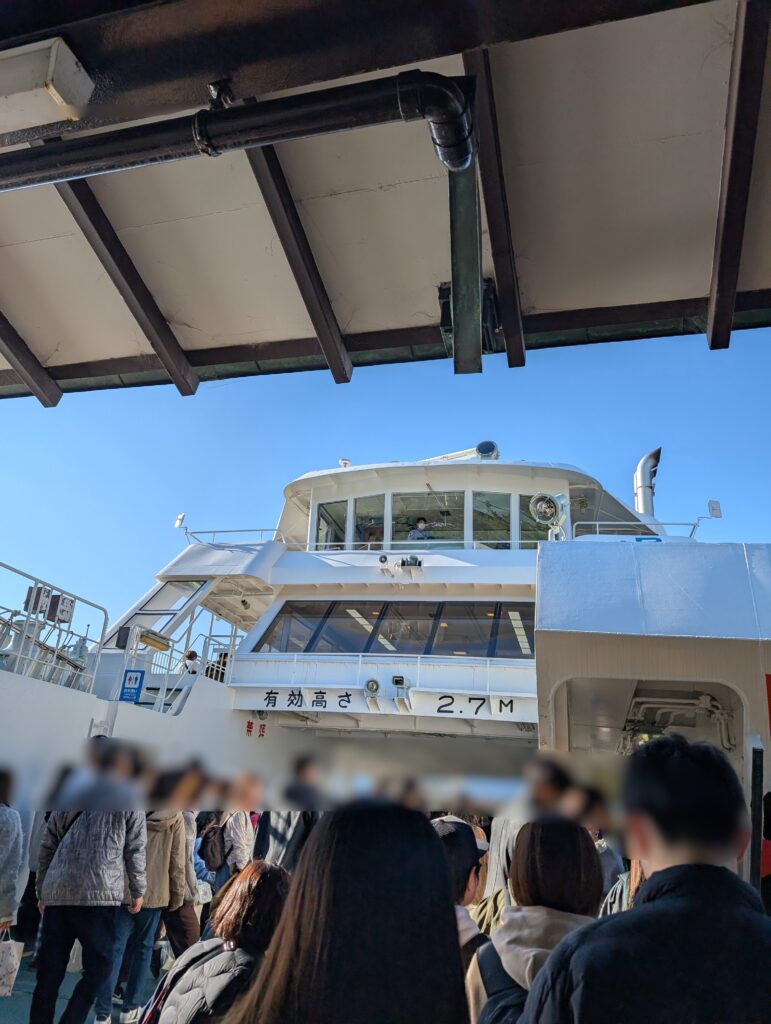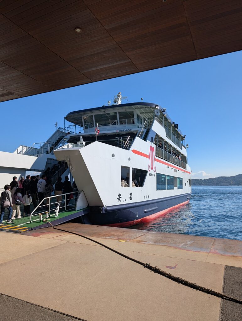 予想はしていましたが、フェリー乗り場からものすごい人でした。JR西日本宮島フェリーと宮島松大汽船の2社のフェリーが入れ代わり立ち代わりどんどん運んでいきます。乗船券を買う人が行列を作っていましたが、交通系ICカードでそのまま乗船できます。