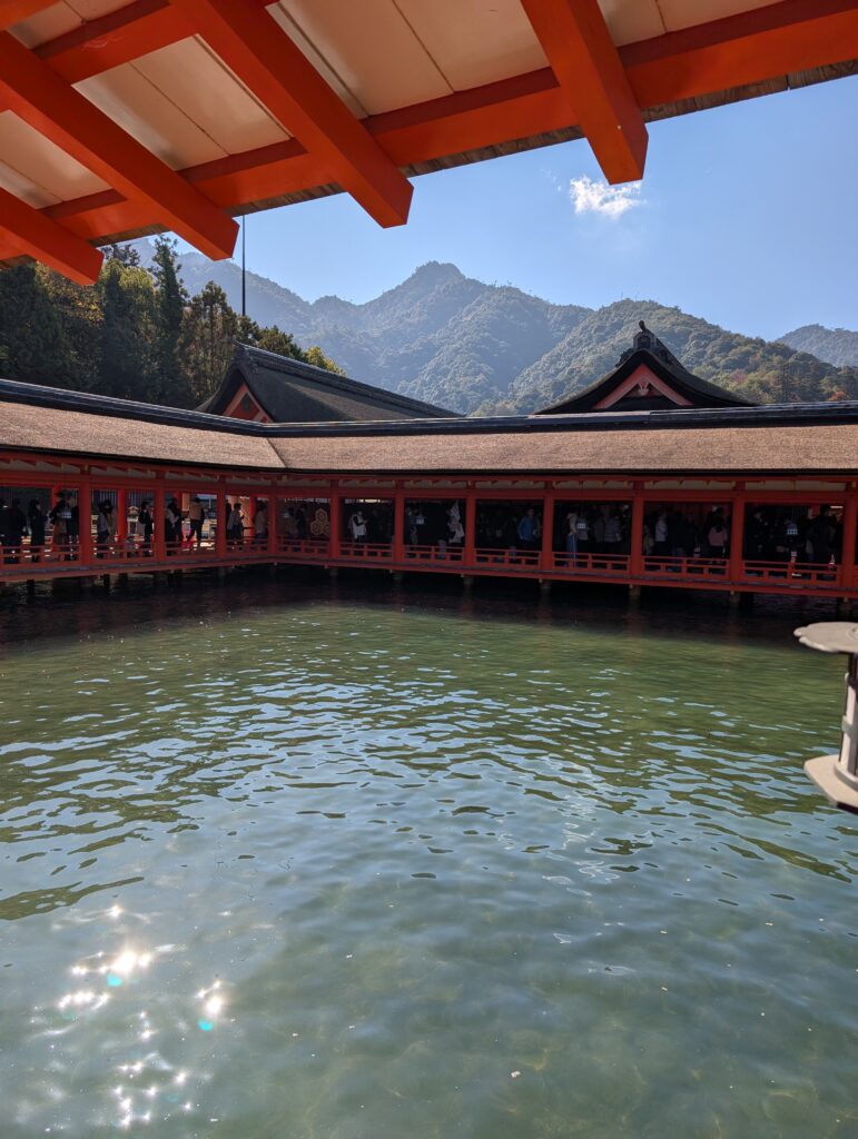 ともかく神社内へ。市杵島姫命、田心姫命、湍津姫命を祭神とし、「御由緒」によれば建立は593年とされます。よく知られているように平清盛により現在の社殿が造営され、現在は世界遺産。観光協会によれば、社殿全体が潮が満ち引きするところにあるのは、島全体が神の島として崇められていて、陸地では畏れ多いと考えられたからとか。