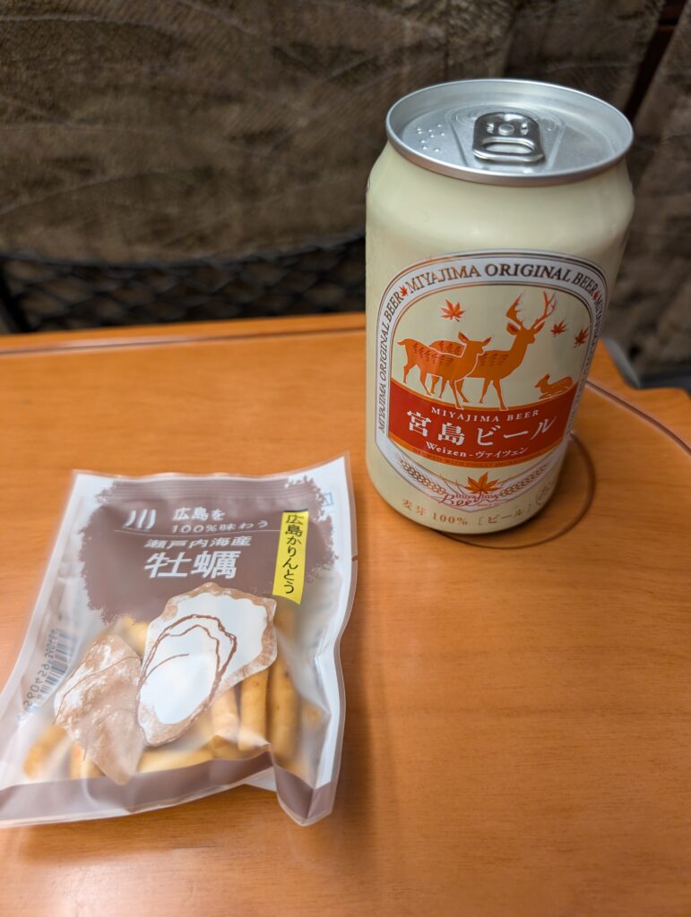 おまけ:帰りの新幹線で。お土産に買った宮島ビールと広島かりんとう。