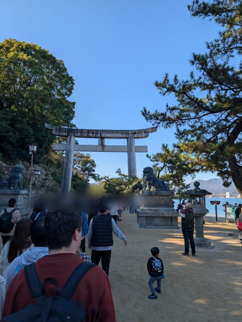 それとは別に、本殿の向かい側、海に向かっても行列が。こちらは海に向かって突き出した先にある燈籠と大鳥居を背景に写真を撮っているのでした。