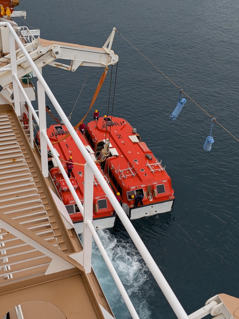 テンダーボートは両舷に一隻ずつ、二隻とも水面に降ろす作業が進んでいました。