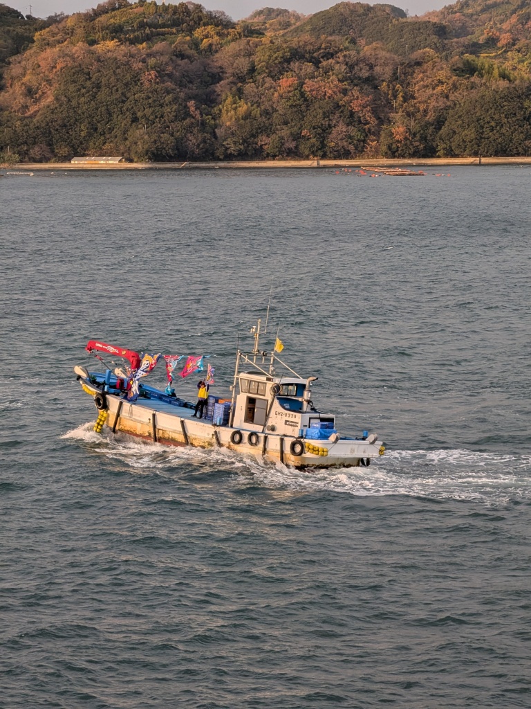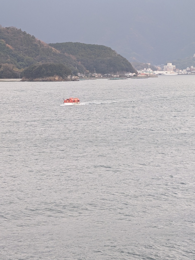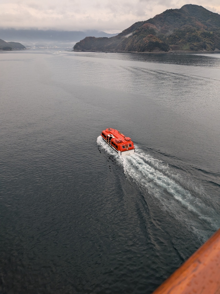 今日は宇和島寄港なのですが、船は港に横付けできません。沖合に錨泊し、テンダーボートで行き来します。