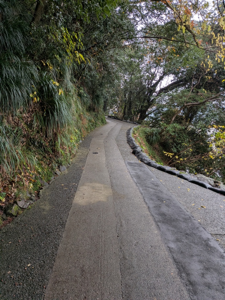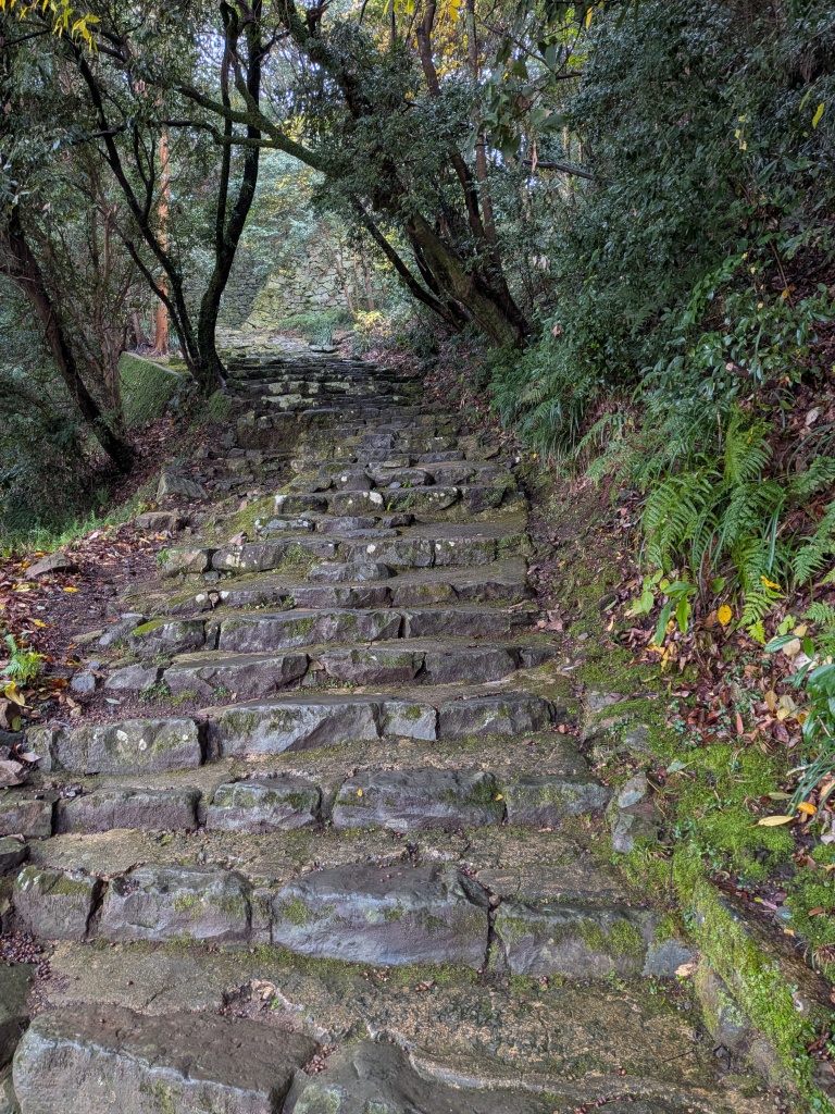 一応、平山城ということになるのでしょうが、標高73mの丘陵は傾斜も急で。門をくぐって少し進むと、急な石段、それも自然石を使ったような石段。そちらは避け、舗装された坂道を登っていきましたが、途中の児童公園を通り過ぎたあたりから石段に、時々雨が降り出すような天気の中、濡れた石段をひやひやしながら登りました(当然、降りる方が怖かった)。