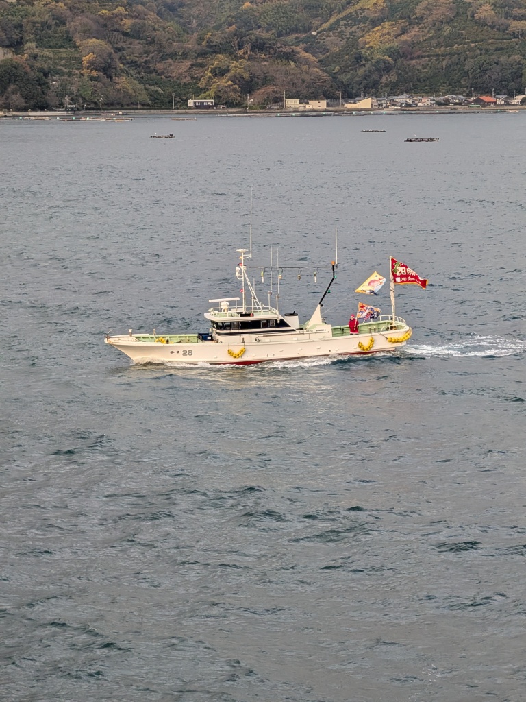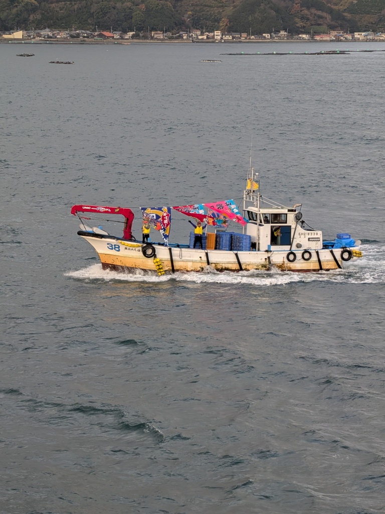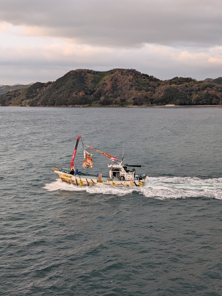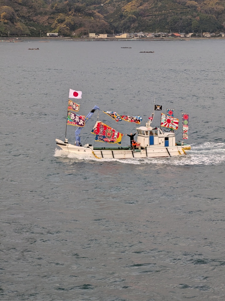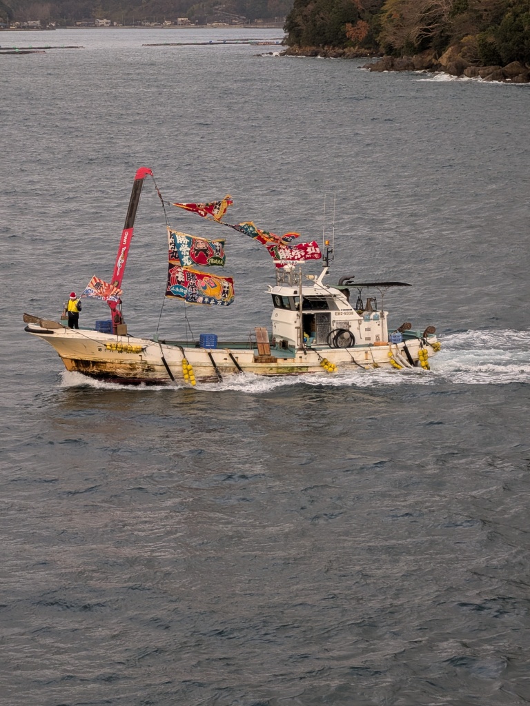 陸の方から、漁船が何隻も、お見送りにやってきて、「にっぽん丸」のまわりをぐるぐる回り始めました。